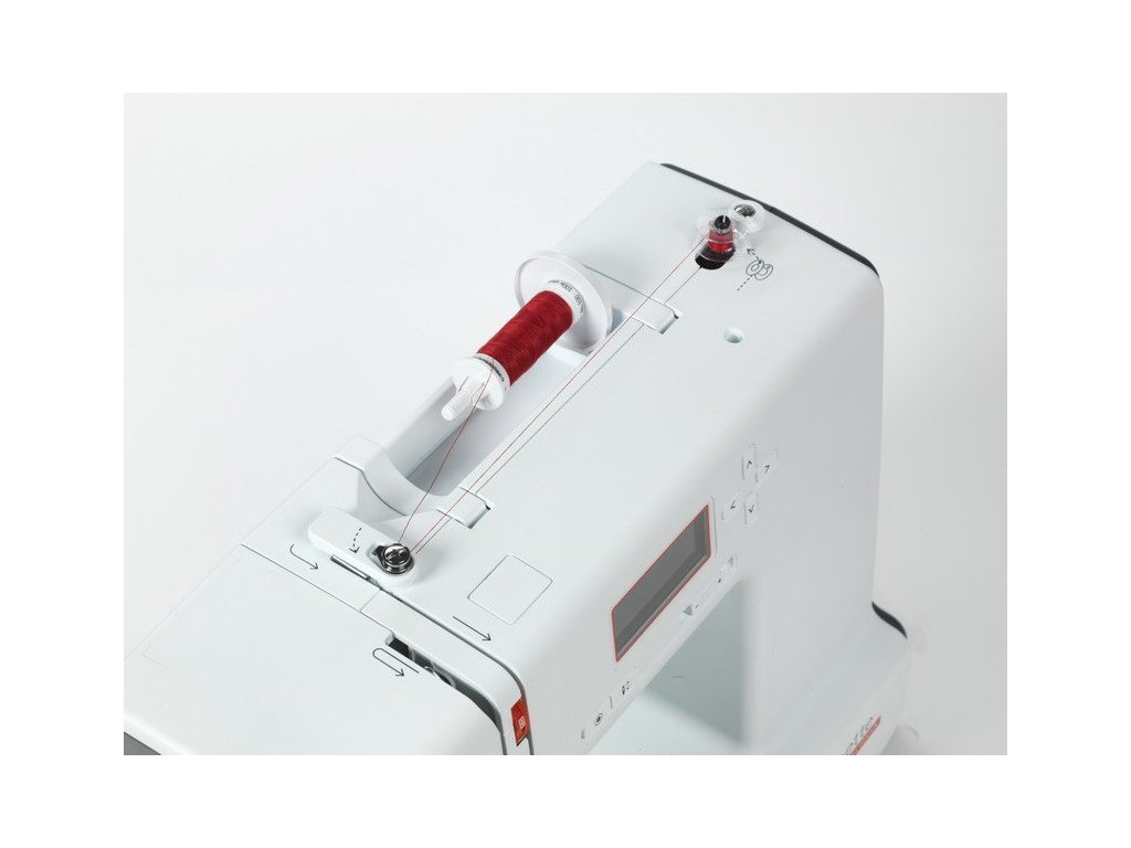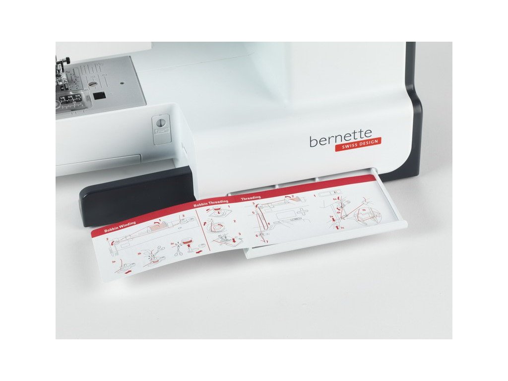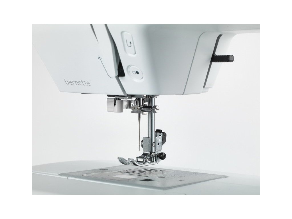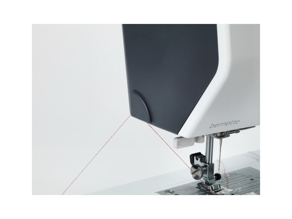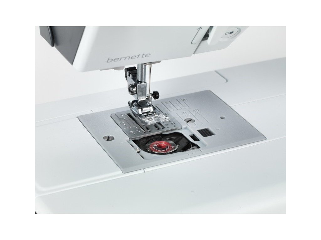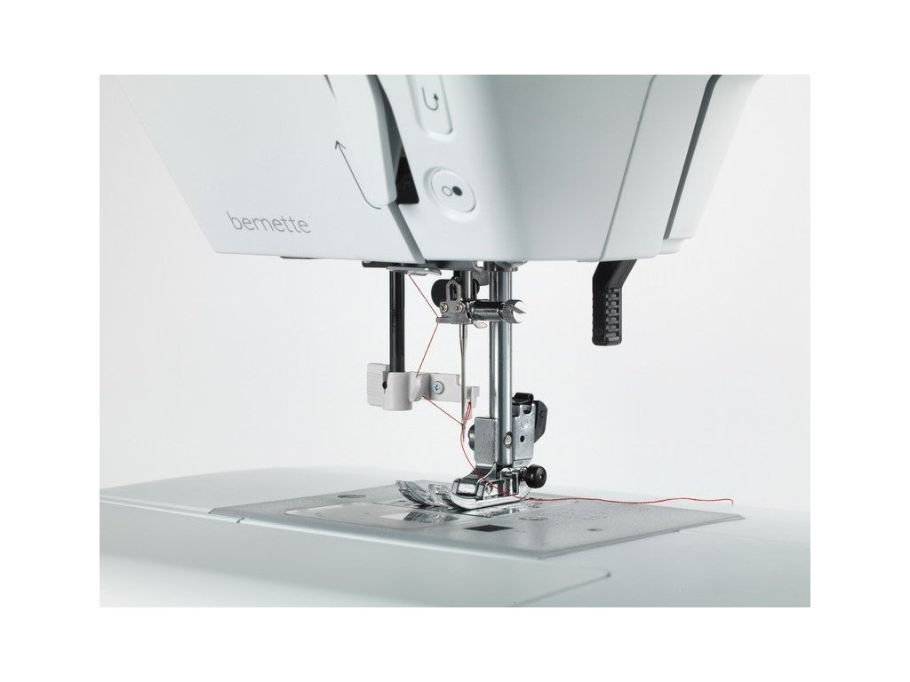 Stroj Bernette 37 vám také umožňuje nastavit maximální rychlost podle vašich individuálních požadavků a použitého materiálu. S jeho zářivým LED osvětlením budete mít vždy dobrou viditelnost při práci. Stroj je dodáván s pěti přítlačnými patkami.