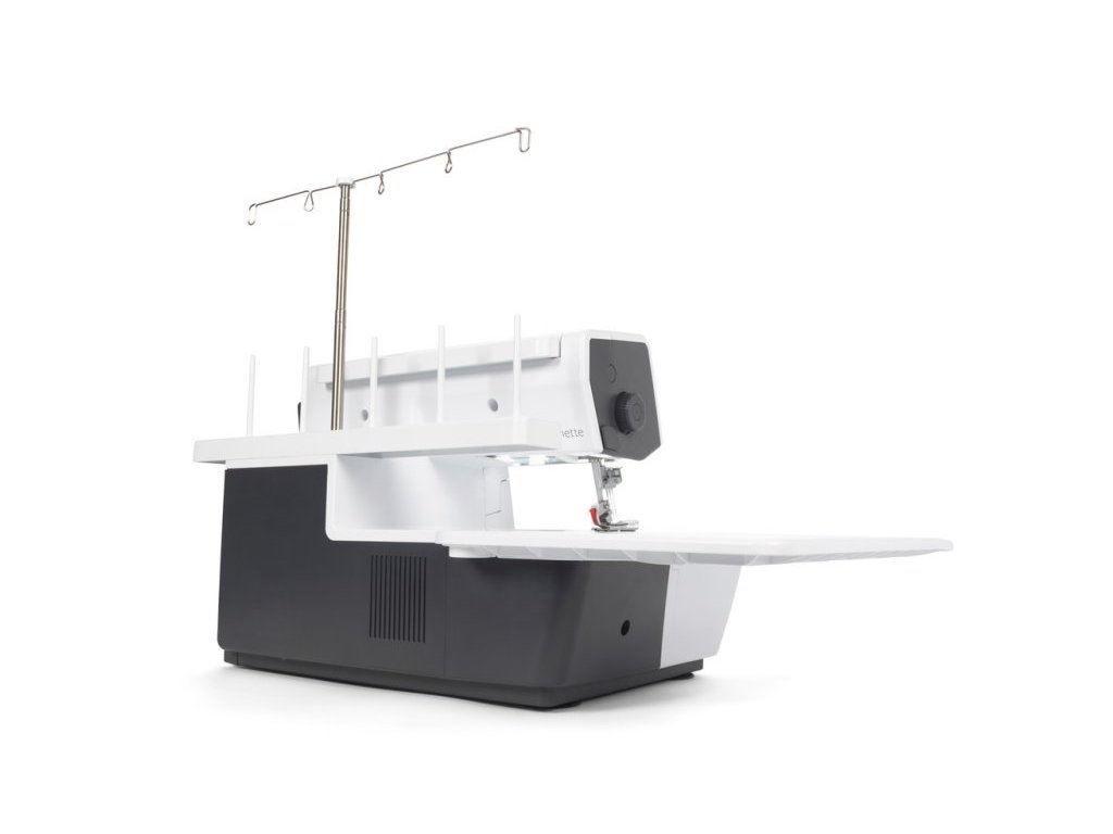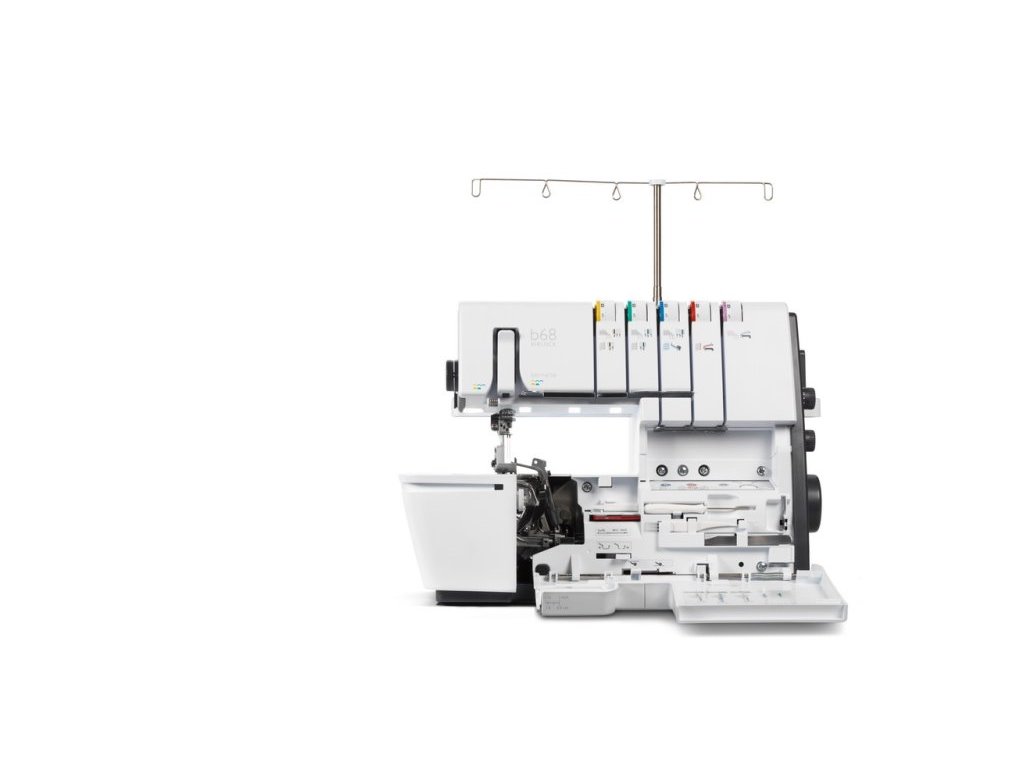 Velká pracovní plocha. Mnoho prostoru vpravo od jehly (130 mm) dává tomuto overlocku další rozměr. Velká pracovní plocha je ideální pro vedení a držení těžkých šicích projektů za jehlou a poskytuje prostor pro všechny úkony v oblasti jehly a chapače: výměna přítlačné patky, připojení konvertoru horního chapače a mnohem více.