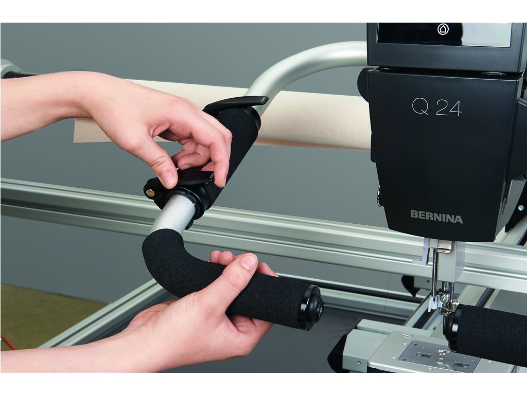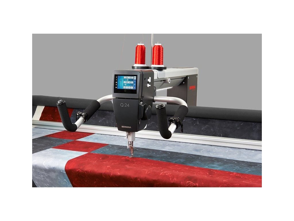 Tichý a silný DC motor a velká výška mezi patkou a stehovou deskou poskytuje dostatek místa pro zpracování i hrubých sendvičů. Funkce hop-hop umožňuje vyskočit na výstupky quiltovací plochy bez zastavení práce. Quiltovací stroj Bernina Q24 je kompatibilní se všemi šicími a quiltovacími patkami Bernina.