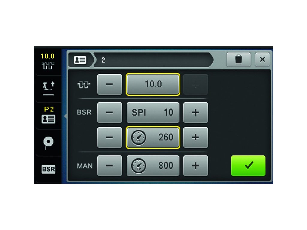 Laserové snímání pohybu zajistí stejnou délku stehu, nastavitelnou od 1 do 25 mm. Stroj je plně ovladatelný zepředu, přičemž pozici jehly lze nastavit pomocí předního ručního kola. Vpředu u hlavy stroje je také možné navlékat spodní a horní nit nebo navíjet cívky pro spodní nit. Automatický navlékač jehly spolehlivě navleče nit do očka.