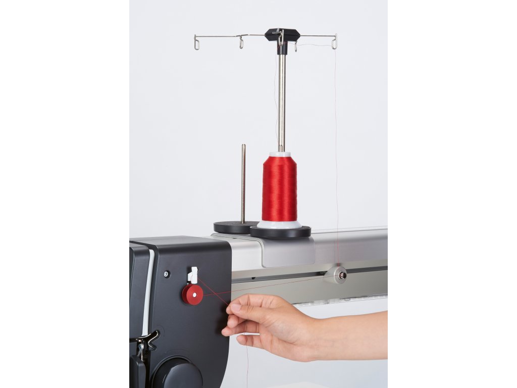 Vpředu umístěné držáky špulek a dráha navlékání jsou snadno dosažitelné a stroj je osnovatelný velmi jednoduše.